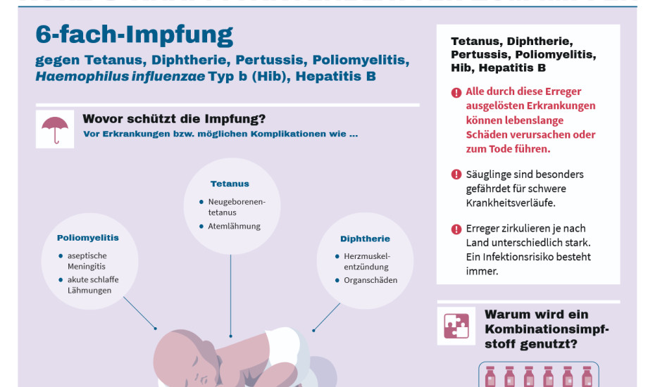 Das Robert Koch-Institut hat ein Faktenblatt zur 6-fach-Impfung gegen Tetanus, Diphtherie, Pertussis, Poliomyelitis, Hib und Hepatitis B entwickelt. Das zwei DIN-A-Seiten umfassende Faktenblatt soll „Impfende in ihrer täglichen Arbeit unterstützen“ und Patienten mit anschaulichen Graphiken die wichtigsten Fakten zur Impfung erklären.